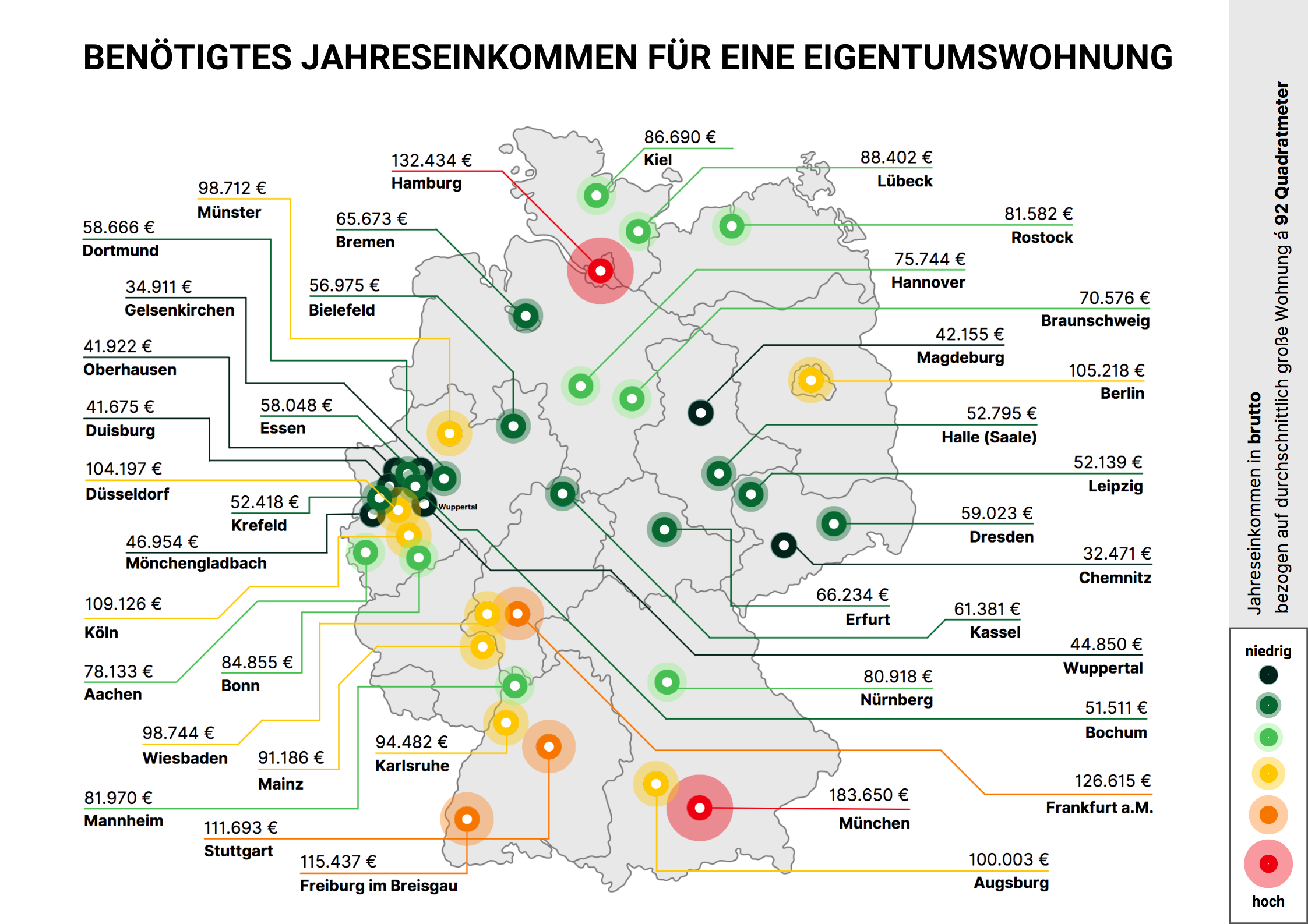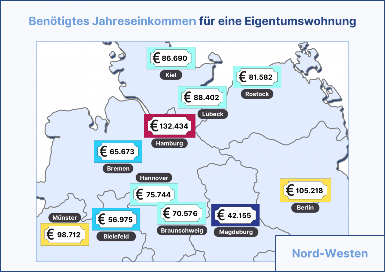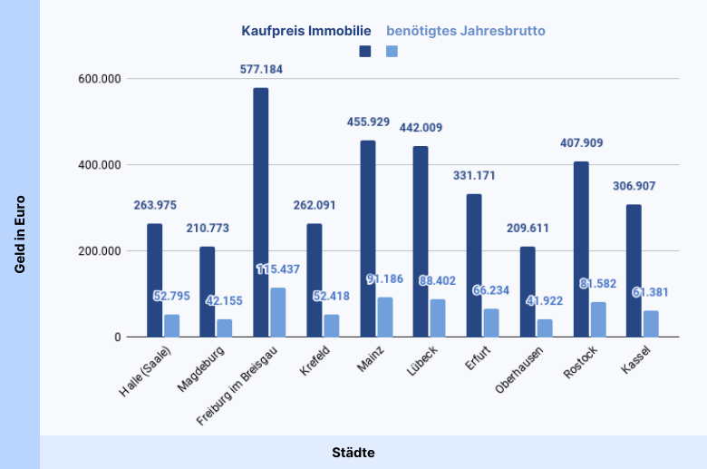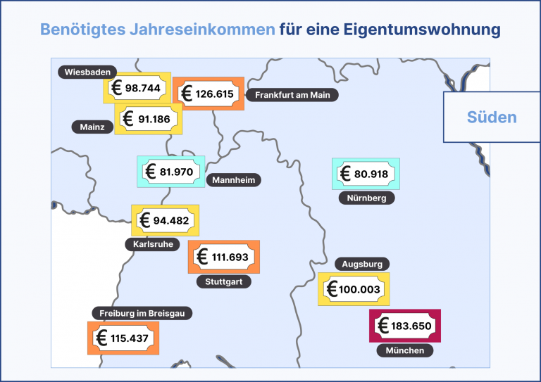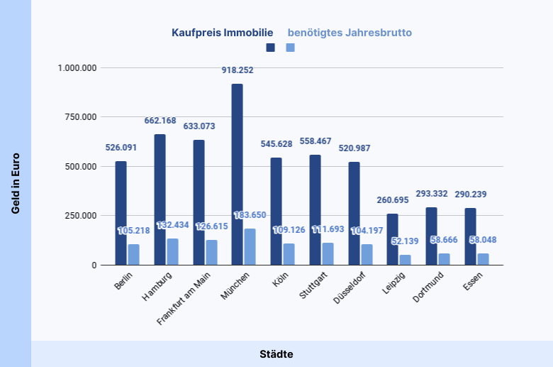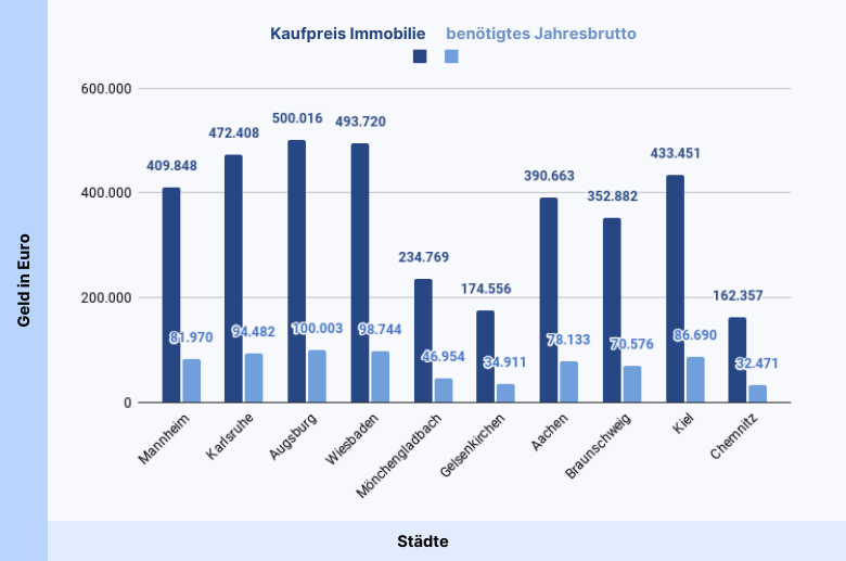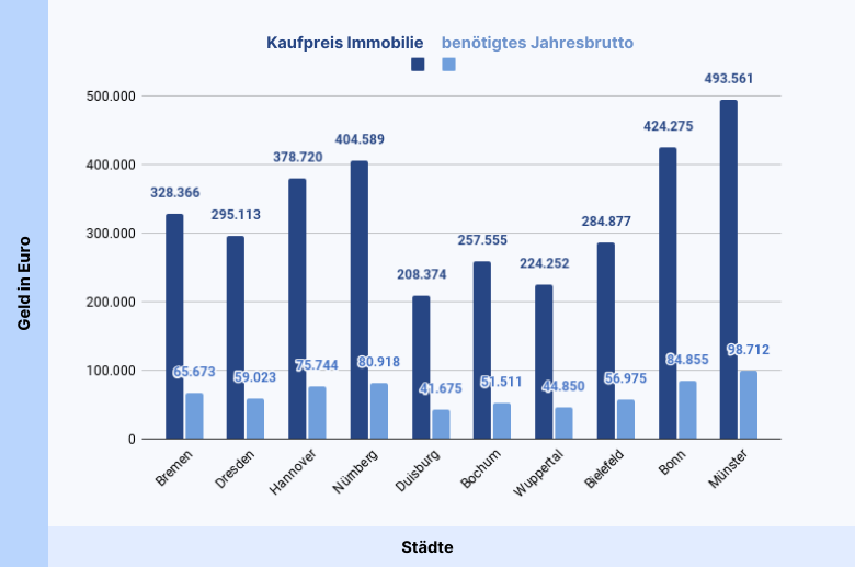 Die Ergebnisse zeigen erst einmal, dass es sich von Stadt zu Stadt stark unterscheidet, wie viel Jahresbrutto du für den Kauf einer Eigentumswohnung benötigst.