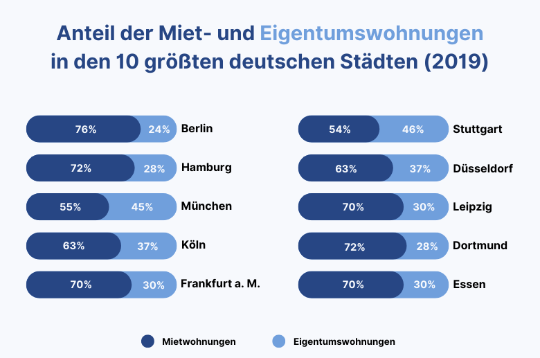 - Berlin hat mit 76% Mietwohnungen und 24% Eigentumswohnungen den höchsten Mietwohnungsanteil innerhalb der 10 größten deutschen Städte