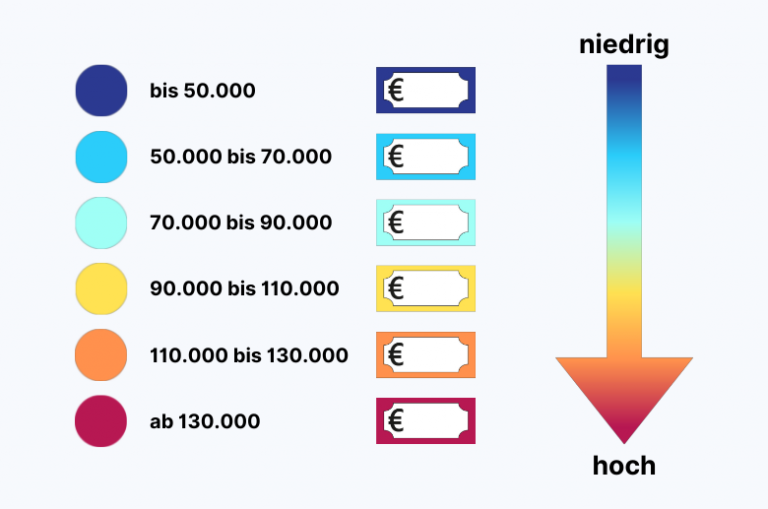 Ich habe das benötigte Jahreseinkommen zunächst in sechs farbliche Klassen unterteilt, wie du der folgenden Grafik entnehmen kannst:
